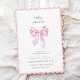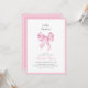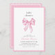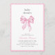 Celebrate the upcoming arrival of a sweet baby girl with this timeless and elegant baby shower invitation. Featuring a pink bow and minimal serif typography, this design blends classic charm with modern minimalism. The clean white background allows the delicate details to shine, creating a refined look that’s perfect for a traditional, chic, or feminine baby shower theme.