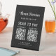 Benutzerdefiniertes schwarzes Tischschild für Ihr Unternehmen mit Ihrem Namen oder Ihrer Marke in einem stilvollen weißen Signaturskript, 2 QR-Codes für Kunden, die auf kontaktlose Zahlung suchen, und Ihrem Geschäftstyp oder Ihrem Firmentitel, Telefonnummer und Straßenadresse oder anderen Text in einfacher weißer Schrift.