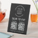 Einfaches schwarzes Tischschild für Ihr Unternehmen mit 2 QR-Codes für Kunden, die nach Zahlungen suchen, sodass Sie jederzeit und überall Zahlungen erhalten können. Laden Sie Ihr Logo und QR-Codes hoch und fügen Sie Ihren Firmennamen, Telefonnummer und Straßenadresse oder andere Informationen in einfacher weißer Schrift hinzu.