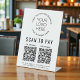 Einfaches Tischschild für Ihr Unternehmen mit 2 QR Codes für kontaktlose mobile Bezahlapplikationen. Fügen Sie Ihr Firmenlogo hinzu, und Bezahlapplikationen QR Codes, Firmennamen, Telefonnummer und Straßenadresse in einfacher Typografie.
