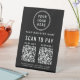 Einfaches modernes schwarzes Tischschild für Ihr Unternehmen mit 2 QR-Codes für Kunden zum Scannen kontaktloser Zahlungsapplikationen. Fügen Sie Ihr Logo, QR-Codes und Payment-App-Namen, Firmennamen, Telefonnummer und Straßenadresse in einfacher weißer Schrift hinzu.