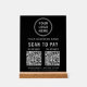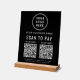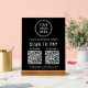 Create a polished, modern checkout experience with this elegant Scan to Pay acrylic tabletop sign. Designed with a black acrylic panel and solid wooden base, this sign adds a professional, upscale look to countertops, reception desks, and checkout stations while making it easy for customers to pay instantly. The clean layout showcases your logo and business name at the top, followed by a scan to pay call-to-action and 2 QR codes for popular payment apps. Upload your QR codes and add your QR code labels, address, phone number, website or other text to keep your business information visible and accessible. Ideal for boutiques, salons, cafés, spas, pop-ups, studios, and service-based businesses, this sturdy acrylic sign is both functional and stylish. It encourages fast, contactless payments while reinforcing your brand’s professionalism and attention to detail.