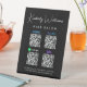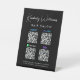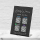 Chic schwarz pedestal Tischschild für Ihr Geschäft mit Ihrem Namen oder Ihrer Marke in einem stilvollen weißen Signaturskript und Venmo, Paypal, Zelle und CashApp QR Codes für Kunden zu scannen nach Zahlungen. Laden Sie Ihre QR-Codes hoch und fügen Sie Ihre Kontaktdaten in sauberer weißer Schrift hinzu.