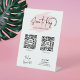 Modern Blush Pink Scan to Pay Zeichen mit Platz für 2 QR Codes für scannbare Zahlurls - kann für PayPal, Venmo, Google Bezahlung oder jede andere Zahlungsmethode verwendet werden. Dieses Podestschild zeichnet sich durch einen weichen, rosa Aquarellhintergrund, trendige Script-Schriftart und 2 QR-Codes in der Mitte sowie soziale Medienlinks unten aus. Fügen Sie einfach Ihre eigenen QR-Zahlungscodes und Ihren Firmennamen oder Firmenlogo hinzu, Sie können sogar die Farben bearbeiten und ein individuelles Zahlungszeichen erstellen, damit Ihre Kunden mit ihrem Telefon oder Tablet-Gerät einfach scannen und bezahlen können.