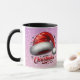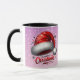 A vivid red Santa hat with plush white trim and twinkling snowflakes; bold festive typography adds warmth, ideal for holiday apparel, gifts, and seasonal home goods.