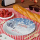 A colorful, wintry paper plate for a Christmas party. The design features snow and three snow-covered trees as a background for a "Merry Christmas" image and a name (or names). The name text is easily changed using the template. If additional changes are desired (different type font, color, size or placement) select "Personalize this template" then select "Edit using Design Tool." See Options for other plate shapes or sizes. If selecting a square plate, use the Design Tool to remove the round shape of the background (if desired). On the left, select "Layers" then select the layer marked "Mask." Then, from the options at the top, select "Mask" and remove it as indicated.