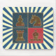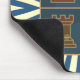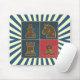 Mousepad, das Schachentwurf mit dem Ritter, dem Pfand, dem Saatkrähe und dem Bischof auf Hintergrund mit blauen Streifen kennzeichnet.