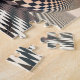 Genießen Sie dieses surreale, dreidimensionale digitale Kunstwerk einer reflektierenden Metallkugel, die auf einer schwarz-bräunlichen Schachbretter-Oberfläche ruht.
