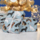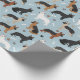 Niedliche Deutsche Schäferhunde in Schwarz und Bräune, Schwarz und Rot, Schwarz und Silber, Weiß und Rücken mit verstreuten Hundeknochen und Pfotendrucken auf hellblauem Hintergrund.