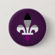 Round Button mit Fleur-de-lis-Symbol (Lilienfleur oder Lilie-Blume) mit Regenbogenstreifen aus schwarz, grau, weiß und lila aus asexuellen Fahnen; Ass Stolz auf lila Hintergrund