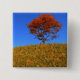 Eine friedliche 3D-Landschaft im Herbst, geschaffen in Vue. Auf einem Hügel, der von einem großen, goldenen Gras bedeckt ist, steht ein einziger orangefarbener Ahorn mit einer Holzbank, um zu stoppen und Erholung zu machen.