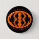 Dieser schöne Halloween-Knopf hat ein orangefarbenes Oval mit sechs Krähen. Jede Krähe hat gelbe Augen mit schwarzen Schülern und ausgestreckten Flügeln. Die Krähen fliegen einander entgegen und bilden eine ovale Form. Der Hintergrund ist schwarz und rund um das Oval, in gruselig orangefarbenem Text steht "Happy Halloween".