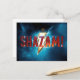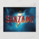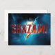 Karo dieses theatralischen Logos für SHAZAM!, mit roter Schrift über einem Blitz.