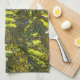 This Kitchen Towel, in a horizontal layout, showers us with sunlight on green umbrellas with a blue sky background. The artwork was made from an original photograph by ZoeSPEAK. The “umbrellas” are the leaves of a schefflera tree which grew from a little sprout in the woods.