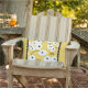 SCHICKE PILLOW_MOD WEISSE U. SCHWARZE MIT BLUMENMOHNBLUMEN IM FREIEN AUF PANTONE 2017 FARBE "PRIMEL-GELB" MIT SCHWARZEM MONOGRAMM.