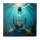 Ein Schiff in einer Flasche sitzend im Boden des Meeres mit Sonnenstrahlen strahlenden Kacheln.