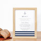 Dieses elegante Küstenzeichen passt zu unserer Hochzeitskollektion Nautical Mix und eignet sich hervorragend, um auf Ihrem Empfang die Menüauswahl des Abends zu sehen. Personalisieren Sie die Header- und Textfelder, die mit einem Trio von nautisch marineblauen Streifen und einem Anker oben geschmückt sind.