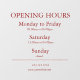 Machen Sie Ihre Geschäftszeiten klar und stilvoll mit diesem anpassbaren Fensteraufkleber! Perfekt für Schaufenster, Türen und Fenster, zeigt dieser wiederverwendbare Aufkleber Ihre Öffnungszeiten mit einem sauberen, professionellen Design, das ins Auge fällt. Einfach anzubringen und zu entfernen ohne Rückstände - ideal für Geschäfte, Cafés, Salons und Büros.
