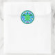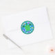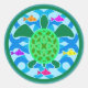 Eine grüne Meeresschildkröte mit gemusterter Muschel, gegen blaues Wasser/Wellenmuster, mit mehreren bunten Fischen. Kreiseldesign mit grüner Grenze. Kunst der Meeresschildkröten.
