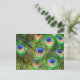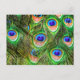 Postkarte mit einem nahen Bild der wunderschönen, schimmernden Augenopfen auf einem Pfauenzug, die die zauberhaften grünen, blauen und bronzenen Details dieser Schwanz Federn hervorhebt. Eine tolle Karte für Vögel und Naturliebhaber. Foto aufgenommen in Arcadia, Kalifornien.