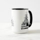 Tasse mit Zeichnungen des berühmten deutschen Schlachtschiffs Bismarck aus dem Zweiten Weltkrieg, auf der der Name des Schiffes in Frakturschrift geschrieben ist.