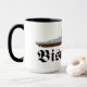 Tasse mit Zeichnung des berühmten deutschen Schlachtschiffs Bismarck aus dem Zweiten Weltkrieg mit dem Namen des Schiffes in Frakturschrift.