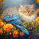 Schlafkatze mit Blauen Federn Nistend in Rose