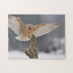 Schleiereule, die zur Spitze im Winter mit Schnee im Hintergrund landet