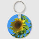 Sonnenblume in voller Blüte mit grünen Blätter und blauer Himmel im Hintergrund.