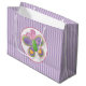 Große, glänzende Geschenktasche mit einem skurrilen, rosa, lila, gelben und grünen Schmetterling in einem weißen Kreis mit einem rosa Rand auf lila-lila Streifen. Siehe passende mittel- und kleine Geschenktaschen, Konfetti, Gefälligkeitskiste, Gefälligkeitsmarke, Etikett, Rundaufkleber, maßgeschneiderte Vinyl-Aufkleber und Verpackungspapier. Die gesamte Kids's Corner Geschenktasche finden Sie in den SPEZIELLEN TOUCHS| Gastgeschenken