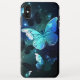 Fantastisch, leuchtend, blau und gelb, Nachtschmetterling auf dunklem Hintergrund.