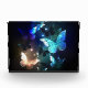 Fantastisch, leuchtend, blau und gelb, Nachtschmetterling auf dunklem Hintergrund.