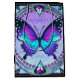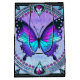 Ein lebendiger Schmetterling mit blauen und lila Farbtönen zentriert sich in einem verzierten, kreisförmigen Design, umgeben von aufwändigen Blumenmustern und dekorativen Juwelen. Die Gesamtkomposition verströmt eine Buntglasästhetik mit einer harmonischen Mischung aus Farben und Symmetrie.