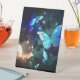 Fantastisch, leuchtend, blau und gelb, Nachtschmetterling auf dunklem Hintergrund.