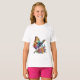 Ein helles und fröhliches Schmetterling-T - Shirt-Design. Das Zentrum verfügt über einen großen, farbenfrohen Schmetterling mit breiten Flügeln, die in lebhaften Farbtönen in Rosa, lila, Blau und Gelb gehalten sind. In der Umgebung des Schmetterlings gibt es kleine Blume,