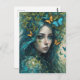 Eine Frau mit blauen Haaren ist von Schmetterlingen und Blätter umgeben und schafft eine mystische und ätherische Atmosphäre. Ihr ruhiger Ausdruck und die lebhaften Farben vermitteln ein Gefühl der Harmonie mit der Natur.
