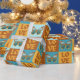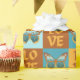 Mit diesem Butterfly-Liebe-Muster wackeln Sie Ihre Geschenke | Blaues und orangefarbenes Schleifpapier. Ein wunderschönes geometrisches Muster von Schmetterlingsquadraten, die sich mit dem Wort Liebe abwechseln. Ein tolles Packpapier für Schmetterlingsliebhaber.