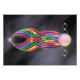 Ein leuchtend farbiger fließender abstrakter, goldfarbener und mit Diamanten und Perlen bestückter gerahmter Fluss. Glatzende, leuchtende Strömungen roter, gelber, grüner, blauer, lila und rosa Kurve glatt, knusprig von einer großen Perle bis zur Spitze, am Ende durch eine Sternexplosion betont. Dieses Regenbogendesign wird vor einem Hintergrund aus schwarzer Seide gelegt.
