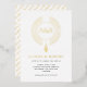 Diese stilvolle Hochzeitseinladung zeichnet sich durch einen weißen Hintergrund mit goldenen Folienakzenten und konzentrischen Kreisen aus. Ihre Initialen werden in einem eleganten Schriftart innerhalb der Kreise dargestellt, der einem Drahtsocher ähnelt. Ein Laubakzent in der unteren Mitte trägt zum Design bei. Die Rückseite der Einladung hat ein diagonales Muster der Namen der Paare in Gold auf Weiß für zusätzliche Verfeinerung.