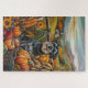 Feiern Sie die Schönheit des Herbstes mit diesem lebendigen Gemälde eines Hundes, der neben einer reichen Erntedank-Ernte sitzt. Die reichen Herbstfarben von Kürbissen, Sonnenblumen und die rustikale Landschaft der Bauernhäuser schaffen eine warme und einladende Atmosphäre, die sich perfekt für jeden Hundefreund im saisonalen Dekor eignet.