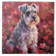 A grey and white schnauzer sits gracefully among soft pink heart shaped flowers, creating a warm, Valentine's day vibe.