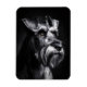 A dramatic close-up of a black and silver schnauzer with expressive eyes and detailed wiry fur, set against a dark background with moody lighting.