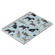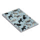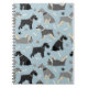 Niedliche Schnauzer-Hunde in Schwarz, Salz und Pfeffer und Schwarz- und Silbermäntel sitzen, stehen und rollen mit verstreuten Hundeknochen und Pfotendrucken auf hellblauem Hintergrund.