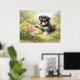 A soft, painterly scene of a schnauzer puppy playfully reaching toward blooming wildflowers in a lush spring meadow, featuring warm sunlight, gentle textures, and a dreamy, storybook atmosphere.