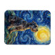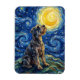 A schnauzer sitting beneath a swirling star-filled sky, gazing up at a glowing moon, inspired by classic post-impressionist movement with rich color.