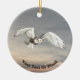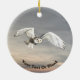Eine digitale Darstellung einer Schneekugel (Bubo scandiacus) überlagert auf einem winterlichen, grauen Himmelshintergrund. Fügen Sie Ihren eigenen Text hinzu. Die bodennistende Snowy Owl ist in den arktischen Regionen Nordamerikas und Eurasiens endemisch. Männchen sind fast rein weiß, während Weibchen, wie in diesem Bild, mehr dunkle Flecken und Balken in ihrem Absturz haben.