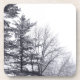 Im waagerechten Schwarz-Weiß-Foto von schneebedeckten Bäumen zeigen zwei Evergreens am links Rand des Rahmens auf mehrere kürzere Laubbäume, die alle schneebedeckt sind. Der Himmel darüber ist weiß. Digitales, schwarz-weißes Foto. Copyright © 2011 Claire E. Skinner. Alle Rechte vorbehalten.