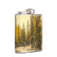 Eine Flasche mit einem schönen Naturfoto. Ein abgeschiedener Winterweg mit hohen schneebedeckten Kiefern. Eine goldene Dämmerung schafft ein zauberhaftes Gefühl für dieses Foto.