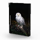 Tierporträtfotografie der majestätischen, schneebedeckten Eule, die auf einem Zweig stehend ist.