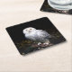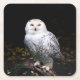 Tierporträtfotografie der majestätischen, schneebedeckten Eule, die auf einem Zweig stehend ist.